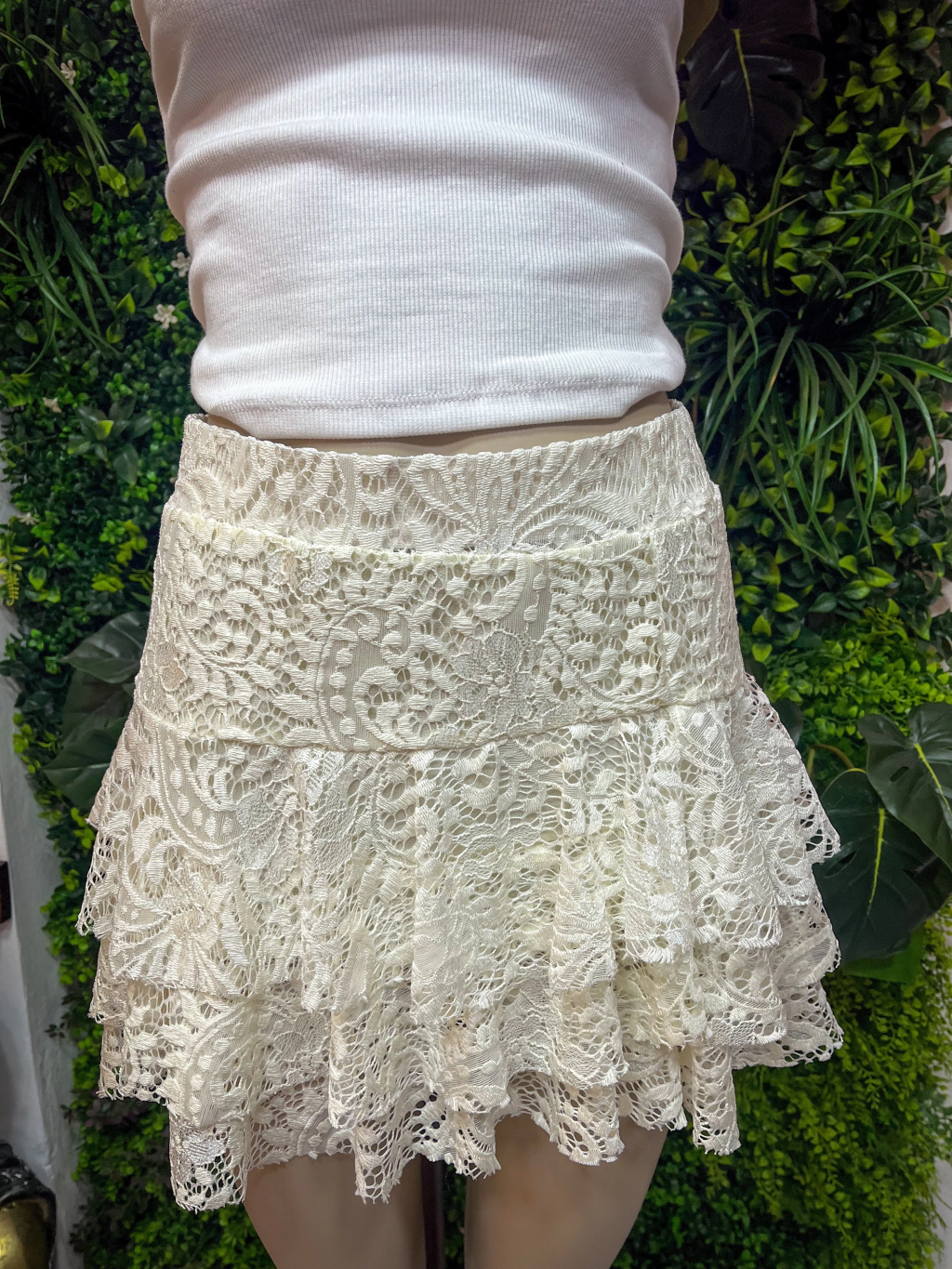 ¡Descubre la Pollera Antonietta, la prenda ideal para destacar tu estilo! Esta pollera mini de encaje con volados es perfecta para quienes buscan un toque femenino y elegante en su vestuario.